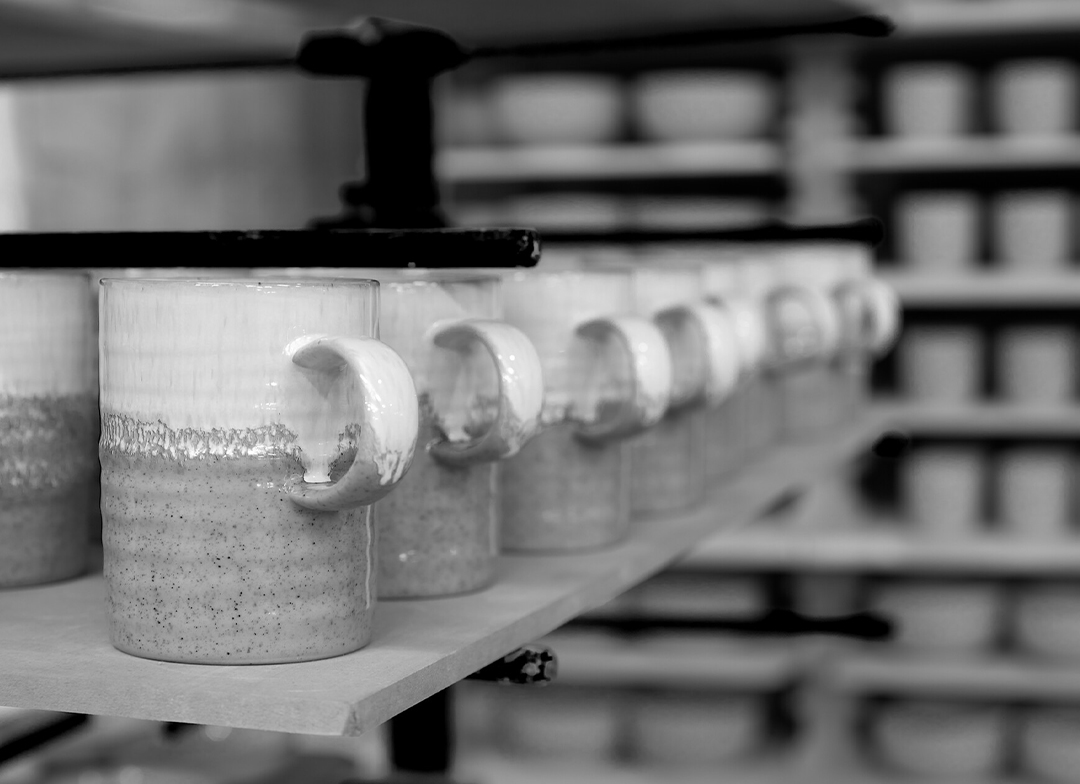 We apply the glaze in three ways: Rinsing, Dipping and Spraying. Any excess glaze is then poured away and recycled. After glazing, the bottom of each pot is cleaned to stop them sticking to the kiln.