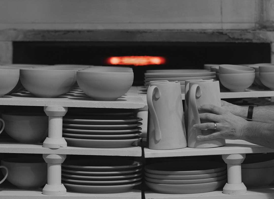 Each piece is placed onto a kiln cart and passes through one of the Denby kilns at approximately 960°C – It takes around 18 hours to kiln fire every piece.
