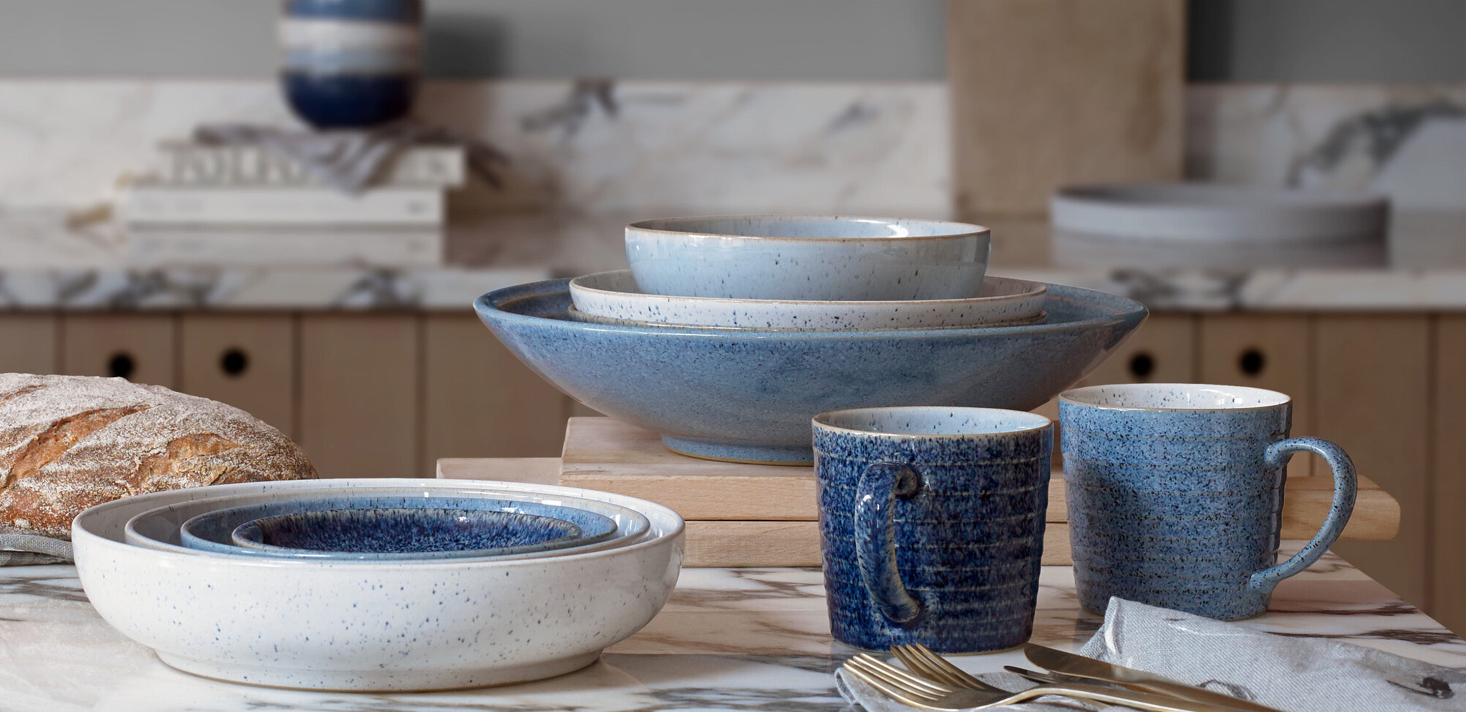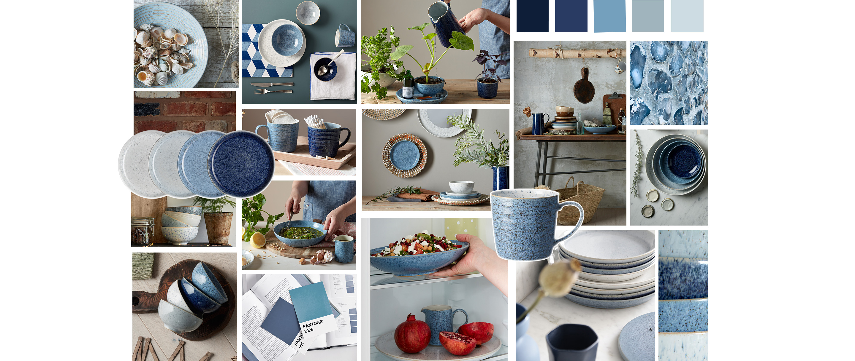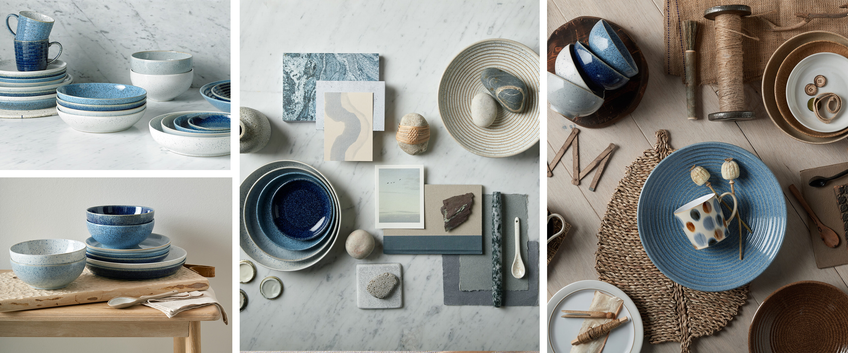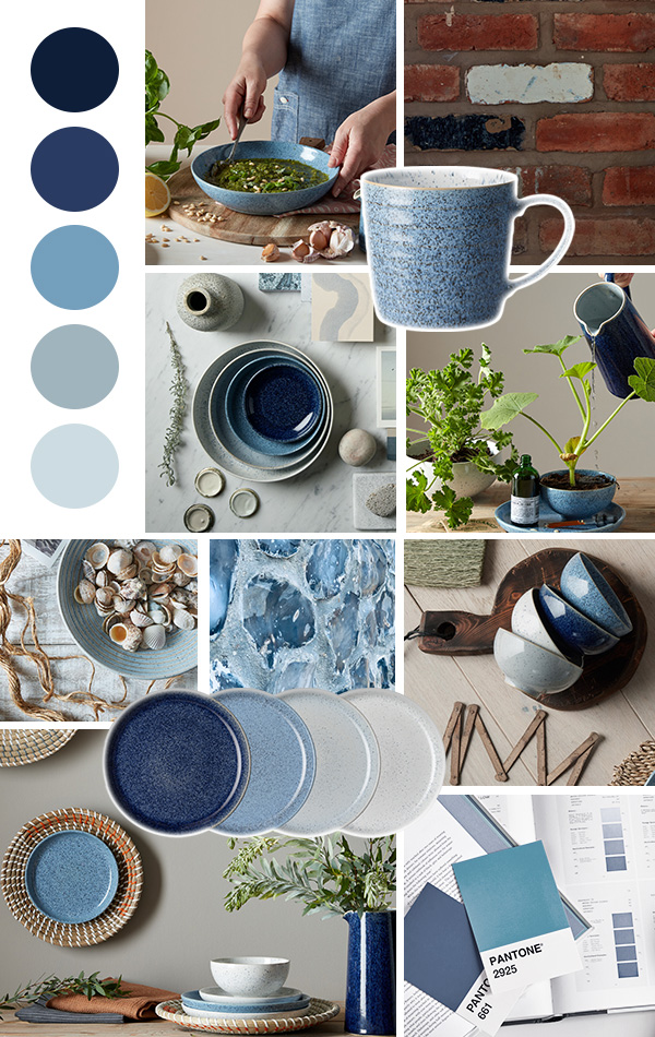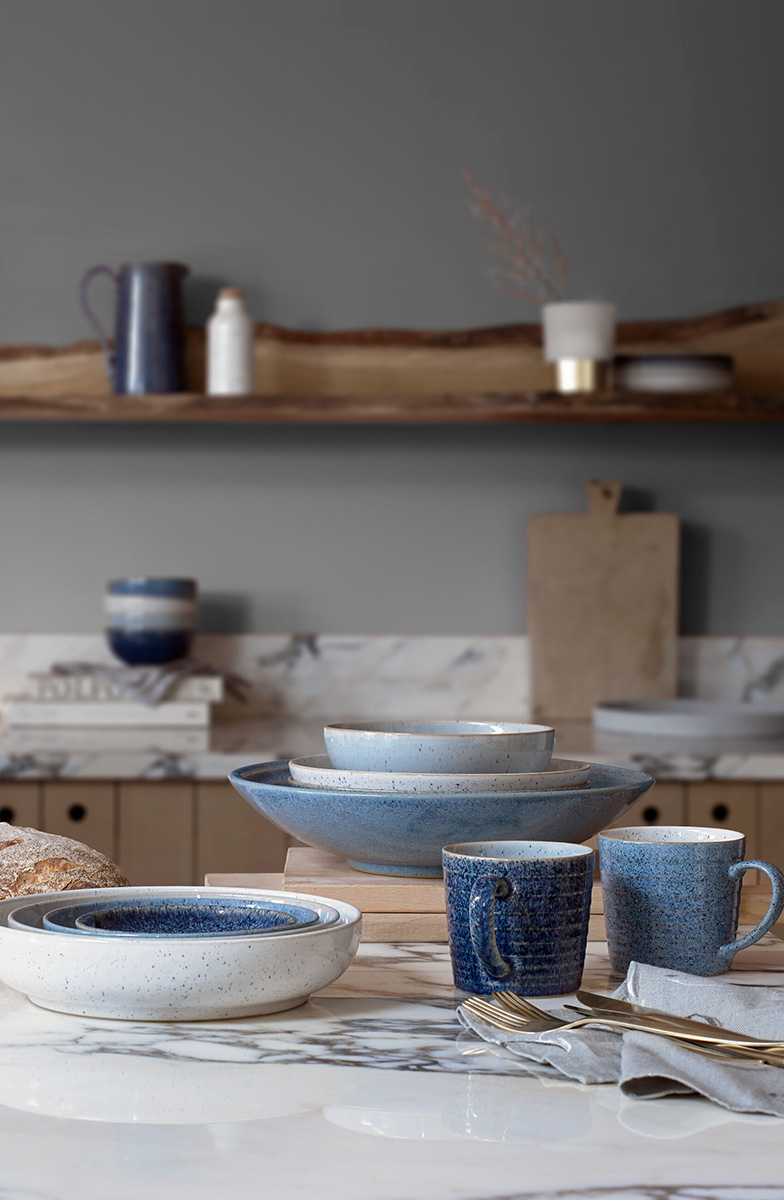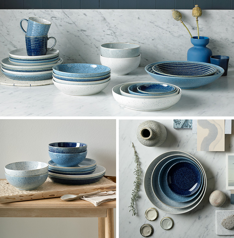 “The colours and textures of pebbles and natural stones such as flint, shale and chalk have been the inspiration behind Studio Blue. We have created glazes that evoke the different surfaces found in these minerals, combining them to create a harmonious range.” – Nicola Wilson, Senior Designer.