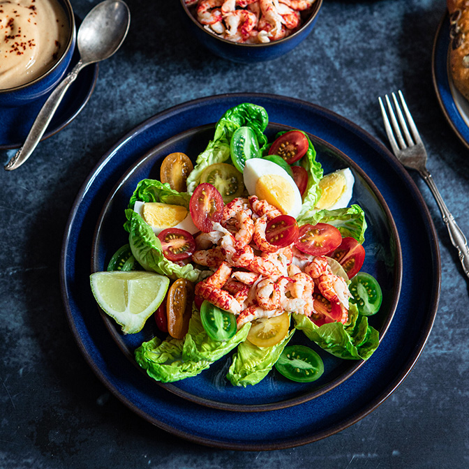 3. Arrange the lettuce leaves, the tomatoes and the eggs over the plates, top with the crayfish, sprinkle some Aleppo pepper and serve with the Marie Rose sauce. Place a lemon quarter on each plate and serve with bread.