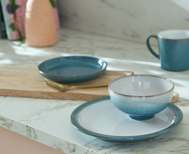 Bring the Mediterranean to your dining table with the cool aquamarine tones of Denby Azure. The cool, uplifting blue tones add a splash of colour, and when paired with the softer hues of Azure Haze, the complete collection creates an effortlessly relaxed atmosphere in perfect harmony with your home.