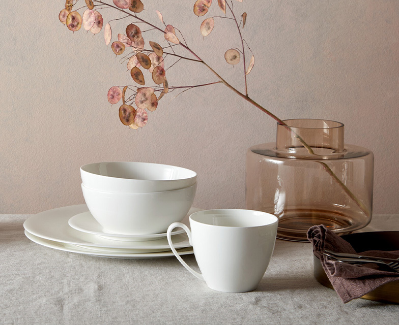 Here on the official store, you'll find Denby white china dinnerware, including plates, bowls and mugs, as well as drinking glasses in complementary designs. You may also be interested in our cutlery, placemats and coasters.