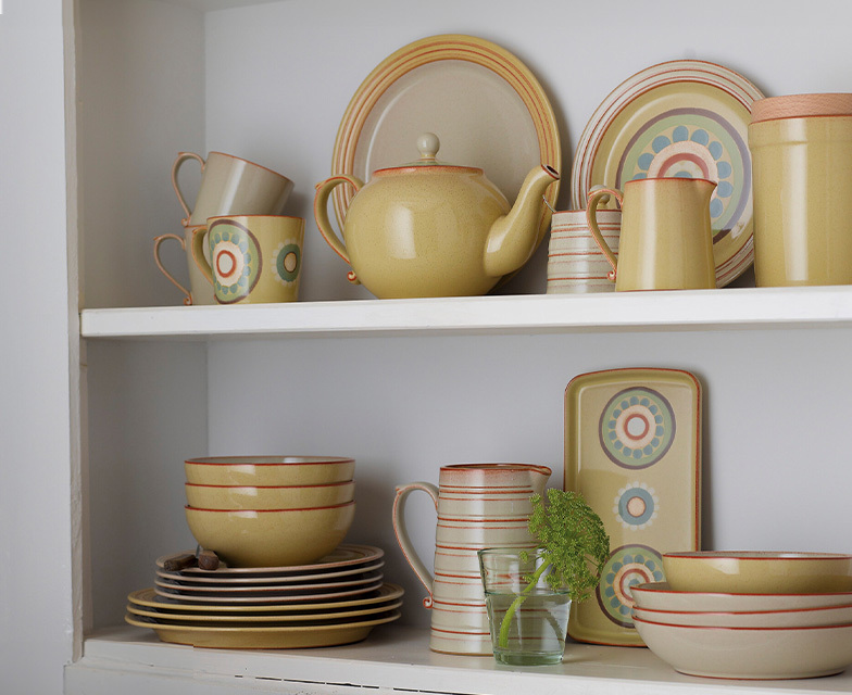 Inspired by our 1960s Arabesque design, Denby Heritage Veranda adds a rustic feel with eclectic tones of buttery yellow, duck egg and sage. Edge detailing and patterned accent pieces add interest and variety to the collection.
