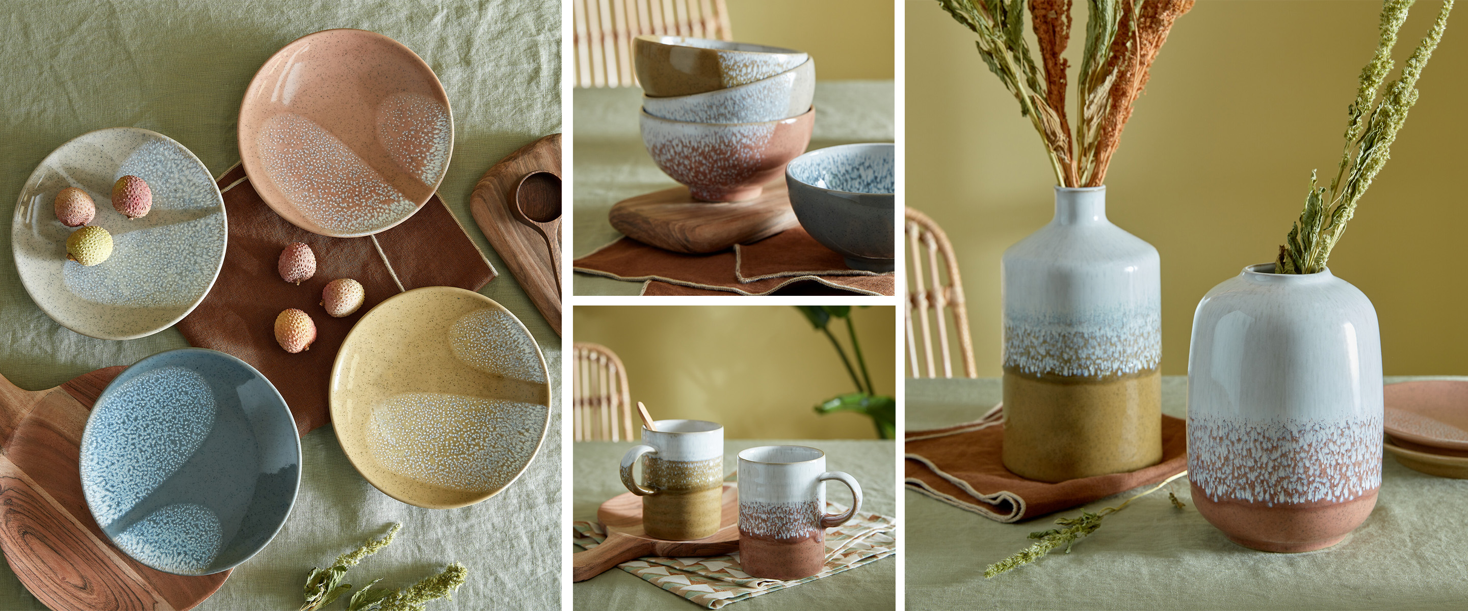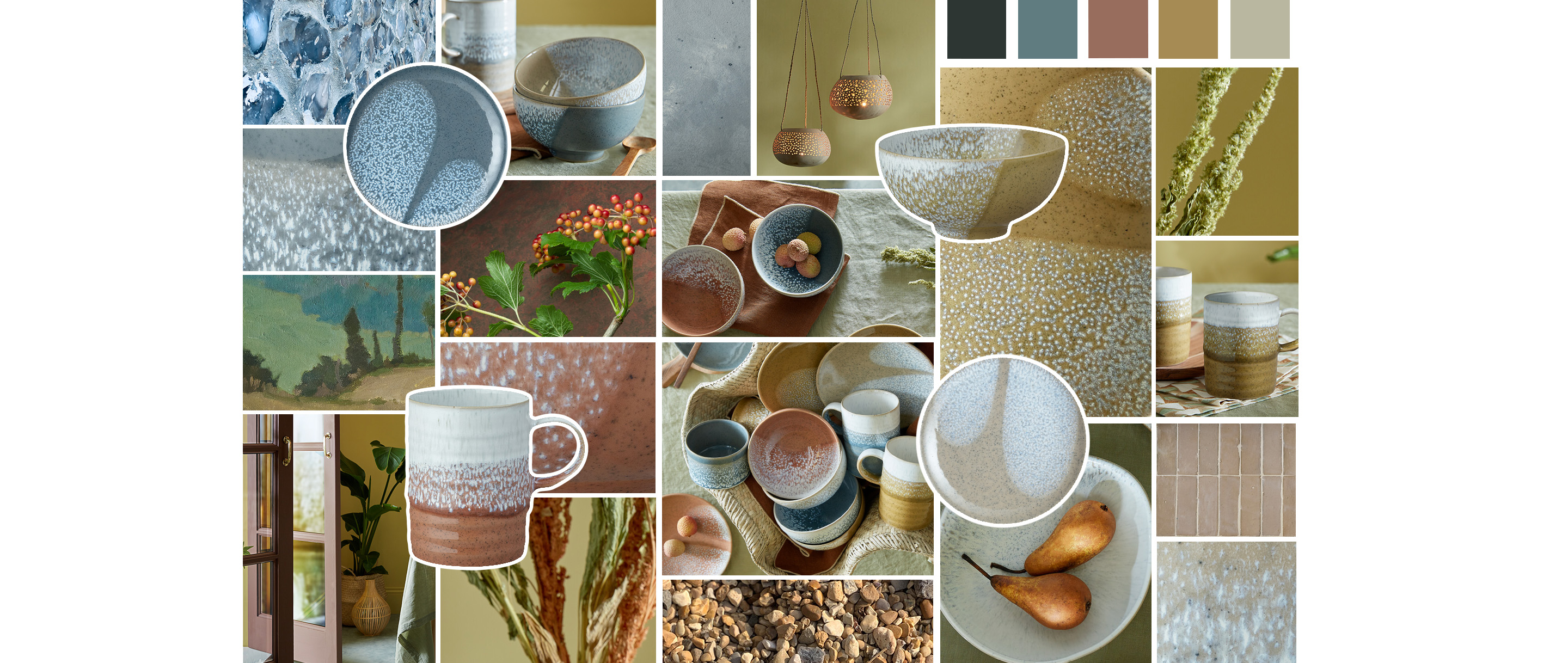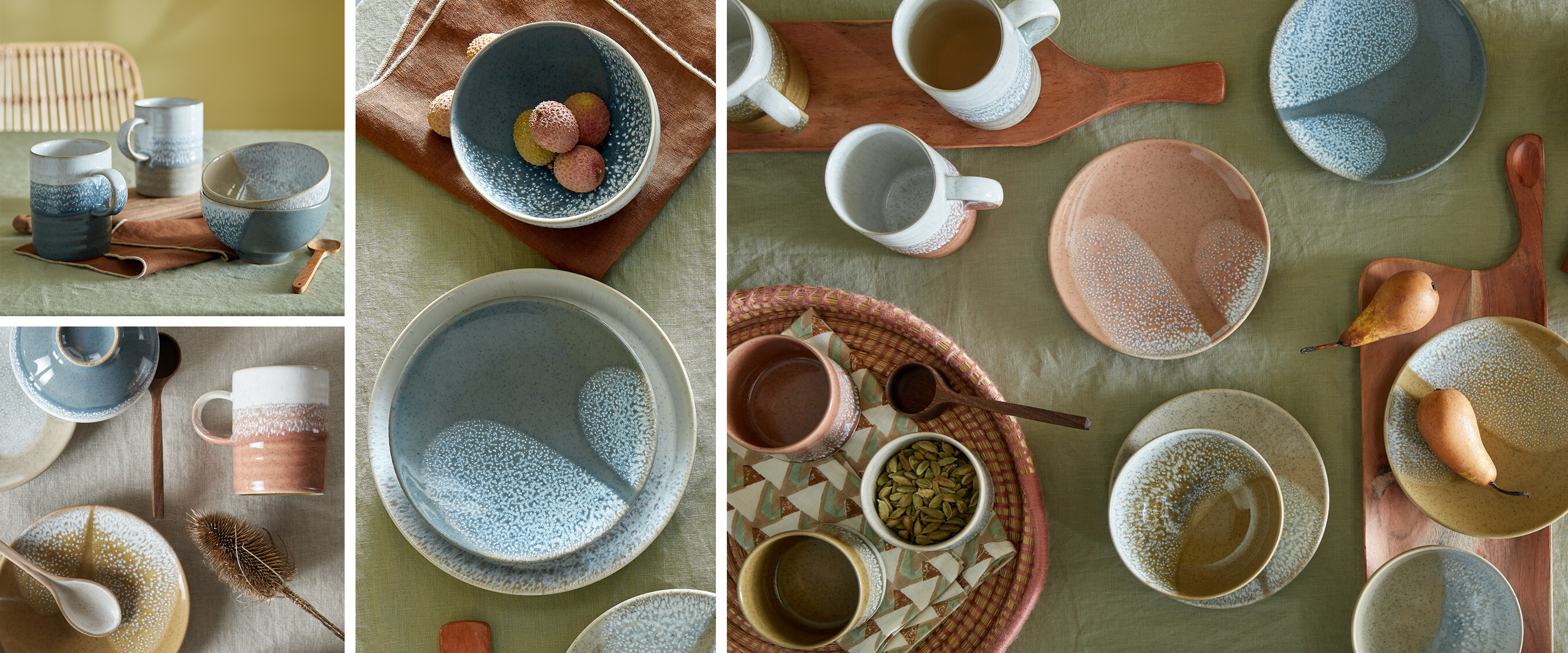 'Three new rich, earthy shades marry perfectly together and with our existing taupe shade of Kiln by Denby. The comforting and humble hues paired with subtle flecks of hand-sprayed glaze make a contemporary yet timeless statement.