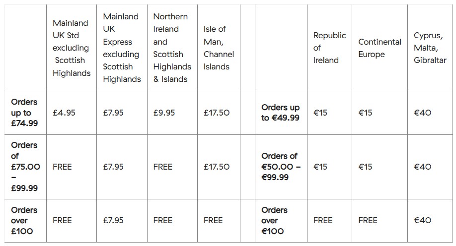 Please note - The free delivery threshold on orders over €100 is only applied after all voucher codes have been added. The basket value must be equal to or greater than 100 euros after any code(s) have been applied. If you are shopping in a local currency then the free delivery threshold will be calculated at the €100 corresponding value in your local currency. Please note that Free EU delivery does not apply to Cyprus, Malta and Gibraltar.