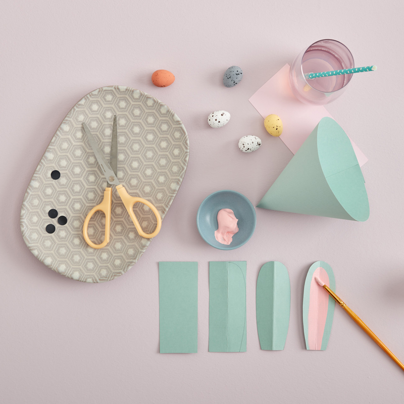 First create your carrot tops by folding the paper strips in half, then curving to make an ‘m’ shape. Staple to hold in place. You will need 2 ‘m’s for each carrot.