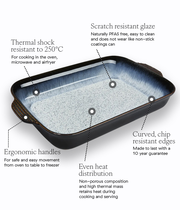 Our ceramic cookware is oven, freezer, microwave, air fryer, and grill safe- plus dishwasher friendly for easy cleaning. It offers even heat distribution, excellent temperature retention, and handles thermal shock up to 250°C. Chip-resistant with a tough, PFAS-free glaze, it won’t rust or suffer baked-on grease like carbon steel bakeware. Cleaning is easy thanks to the durable, smooth finish.
