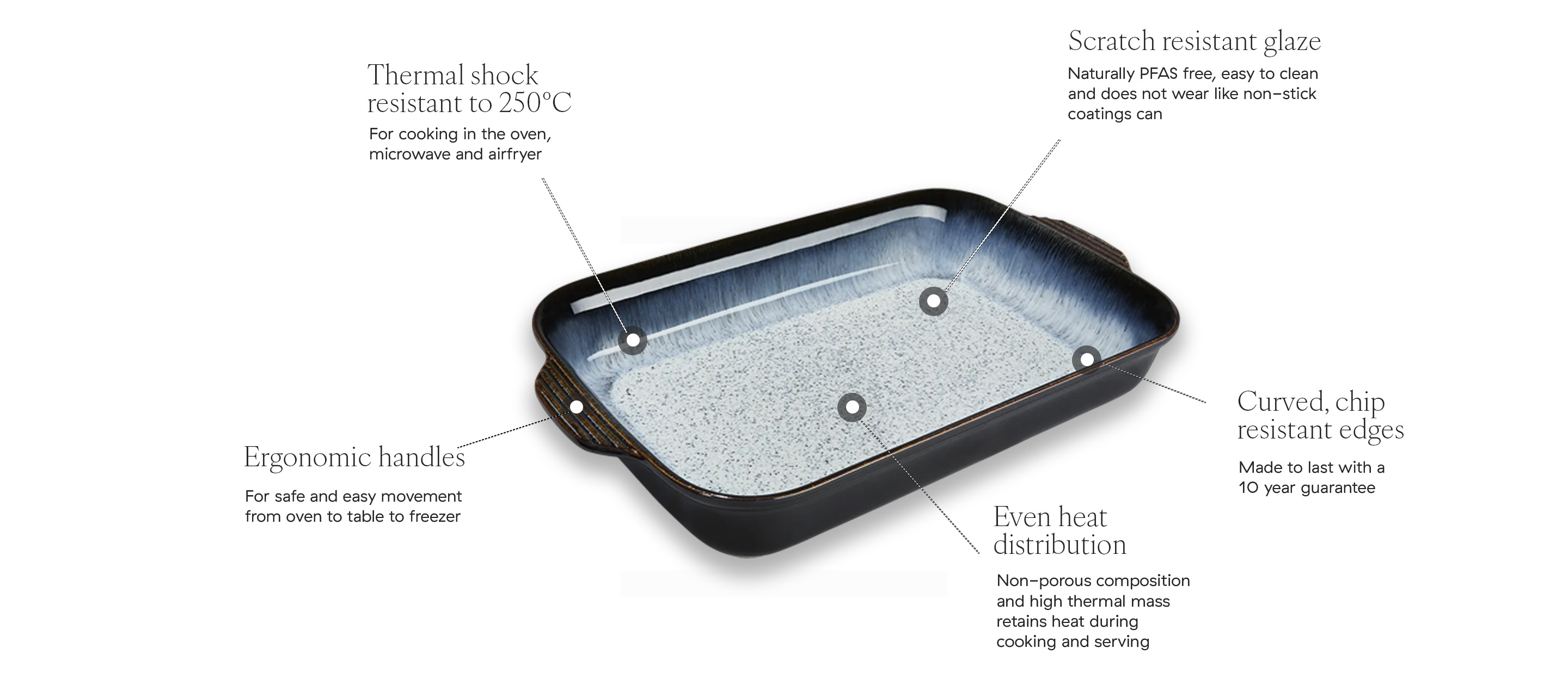 Designed for the love of food, our cookware brings together thoughtful details and lasting quality to make cooking and serving easier. The large rectangular dish fits lasagne sheets perfectly, while high sides on the square dish help contain hot oil when roasting. Ramekins have rims ideal for soufflés, and both the ramekin and small rectangular dish fit in most air fryers. Every piece is made to support the way you love to cook.