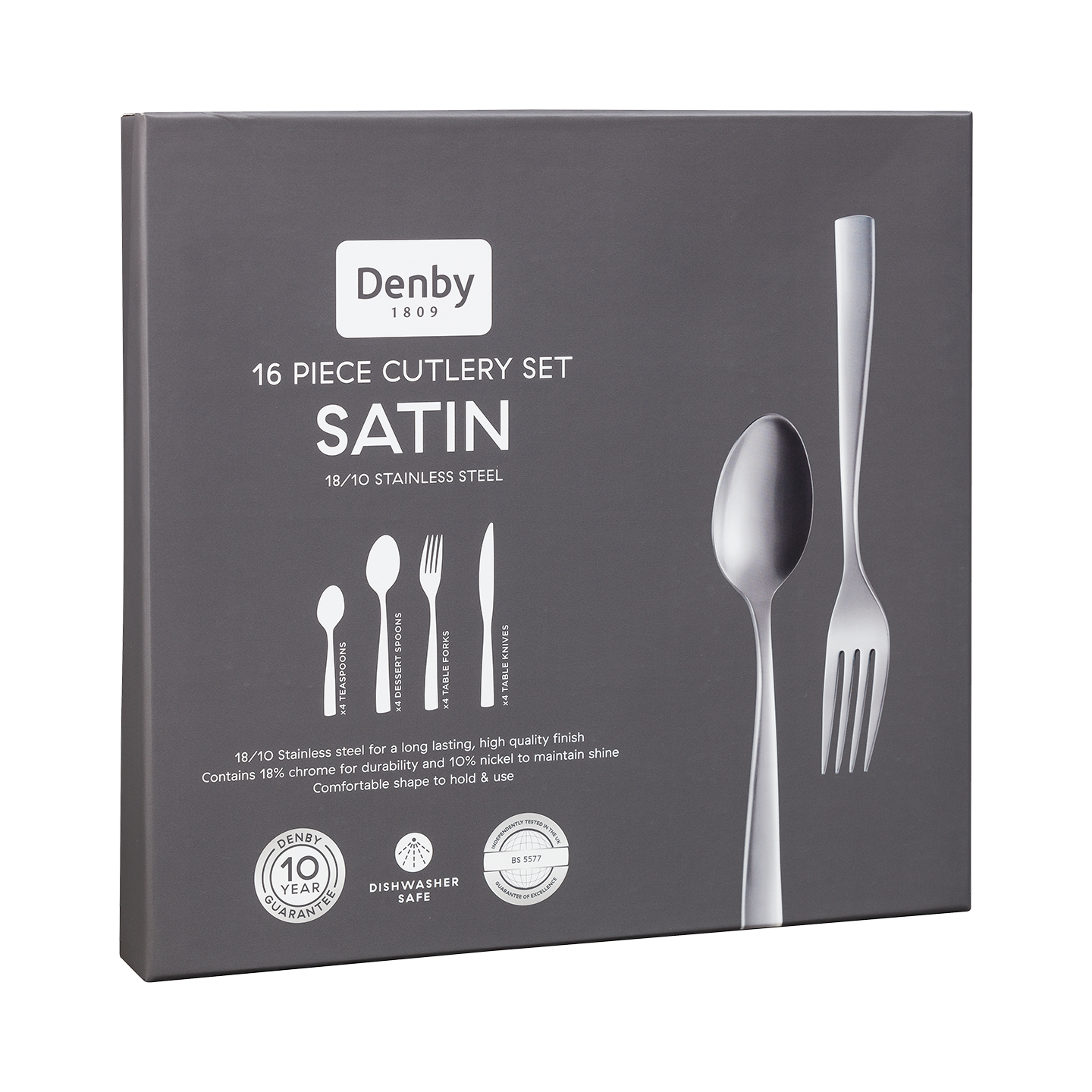 16 Piece Set - 18/10 Stainless Steel. Contains 4 x Table Fork, 4 x Table Knife, 4 x Dessert Spoon and 4 x Teaspoon.